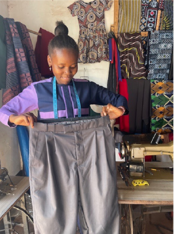 This is a student who was currently on her attachment, or internship, for two months at the end of her second year. She designed and sewed the complicated top she was wearing and was finishing these bespoke trousers for a male customer. Both we meticulously sewn.